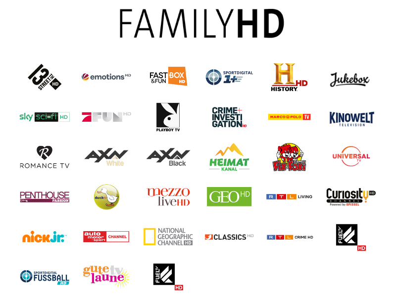 Mit dem FamilyHD-Paket können Sie Ihr HD-Erlebnis nochmals erweitern. 32 weitere Sender werden freigeschaltet, sodass Ihre ganze Familie das optimale Fernseherlebnis genießen kann! Mit vielen Kinderprogrammen, Nachrichtensendern und Erwachsenenunterhaltung – für jeden ist der richtige Sender dabei!